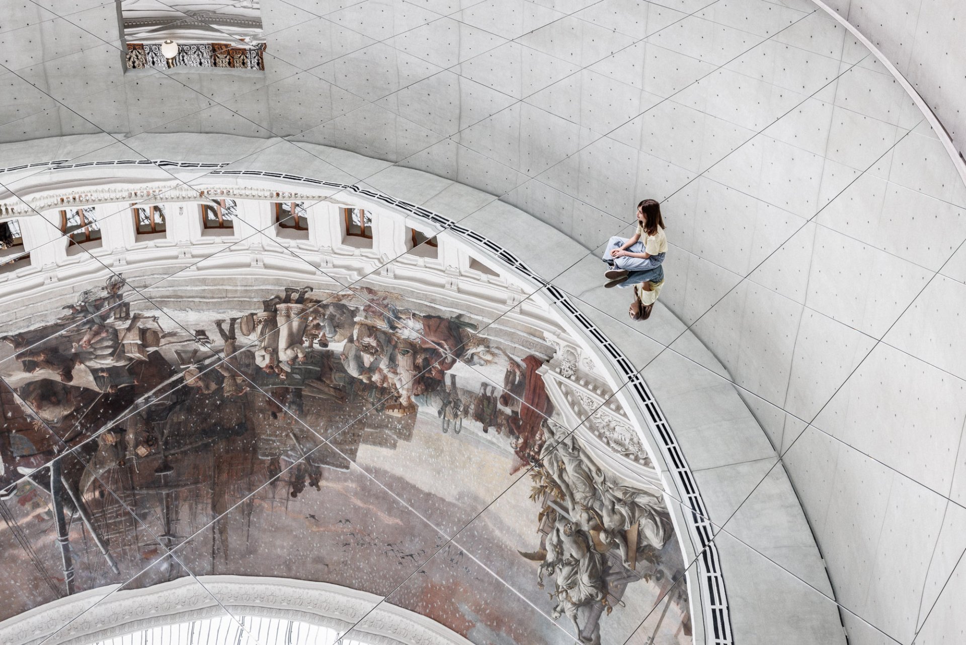 19세기 프레스코 천장화가 돋보이는 돔 구조의 로툰다에 설치된 400여 장의 거울은 공간을 완전히 전환시킨다. 수백 장의 거울은 돔 천장을 바닥으로 끌어내리고, 위와 아래의 구분을 해체한다. 관람객의 모습과 공간, 타인의 움직임이 동시에 반사되며 하나의 풍경을 이루고, 그 안에서 우리는 작품을 바라보는 존재가 아니라 작품을 완성하는 일부가 된다. 김수자에게 거울은 경계를 허무는 매개다. 개인과 타인, 내부와 외부, 나와 사회의 구분이 흐려지며 각자의 존재가 서로 연결돼 있음을 체감하게 한다. 이는 그가 오랫동안 다뤄온 이주와 이동, 정체성의 문제를 공간 전체로 확장한 방식이기도 하다. 이 작업은 결국 김수자 특유의 ‘보따리’처럼 기억과 몸, 타인과 공간을 포용하며 관람자를 세계의 일부로 자연스럽게 초대한다.
